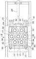 一方、7個の給粉ホッパ11の直下部には、前記シャッタ17と、前記エアシリンダ29とが設けられている。シャッタ17は、図6に示すように7個の給粉ホッパ11の底口と略同一の円形状に形成した7個の孔32をそれら底口と同じ配列パターンの位置に穿孔させていて、エアシリンダ29のロッド伸縮作動に伴ってシャッタ17を水平移動させて、7個の孔32を各底口に全て合致させる一斉開口状態と図6に示す一斉閉口状態とに切り替え作動し得るようになっており、当然のことながら、この一斉開口状態は7個の給粉ホッパ11をダイホルダ8の上面に沿う合心位置にさせた充填動作の際に同期して行わせ、一斉閉口状態は充填操作以外の時期において行わせるものであるのは言うまでもない。なお、図6、7において33は、張り板30に取付けたガイド筒であり、また、34は、ガイド筒33に挿通してシャッタ17に取付けたガイド棒である。