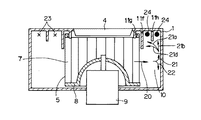 図9および図10は本発明による第8の実施の形態を説明する簡略図である。この実施の形態は、図2に示す第1の実施の形態で説明した構造に、さらに第3のリブ11hをハウジング1の上面に設置した例である。第3のリブは、図9の破線で示すように、遠心多翼ファンロータ5回転に伴う風の主流方向を示す流線23、流線24に沿う形で、ファン12の回転軸を中心として、送風通路10内を螺旋状にその曲率半径を漸増させ、最後は送風口13に沿うように設けられている。