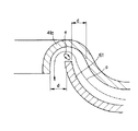 これに対し、特開平5‐296194号公報には、図14に示すようにベルマウス41とシュラウド61との隙間を少なくかつ長くし、さらに風の折り返し部42を設けることにより、流線21aに沿う風の流れを低減させるようにした遠心送風機が開示されている。この遠心送風機では、図15に示すように、ベルマウス41とシュラウド61とで形成される隙間を流線21aに沿って流れる風はスムーズな流れとなっているため、この流線21aに沿う風の流れを抑制するためには、隙間を極力詰めるか、あるいはベルマウス41とシュラウド61とで形成される隙間部をできるだけ長くする必要がある。