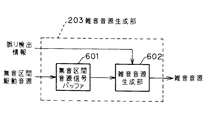 図6は本発明の請求項6に対応し、請求項2から5のいずれかに記載の音声符号化装置における復号側の快適雑音生成器105内の雑音音源生成部203のブロック図を示したものである。図6において、601は無音区間の音源信号を記憶する無音区間音源信号バッファ、602は無音区間音源信号を用いて雑音音源を生成する雑音音源生成部である。