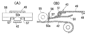 前記逆転ローラ55の直前位置には、下端と第2搬送ベルト42の上面との間に紙幣Pが通過可能な間隙をおいて規制板56が固設され、この規制板56の下端縁に図5〜図7に示すように形成された切欠部57,57に前記押え板50の端部50aが係合することにより押え板50の下流端の移動範囲が規制され、上方に跳ね上がらないようになっている。