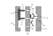 また、固定側金型12には、1次成形用ランナー13とゲート13a及びそれに連続する1次成形用キャビティ20が形成され、さらに、2次成形用ランナー15が形成されている。12aはキャビティ逃げである。