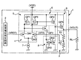また、ボルテージレギュレータ1は、電源電圧VDDと差動対4の一方のトランジスタとの間に一方の出力端が接続された第1カレントミラー回路5と、電源電圧VDDと差動対4の他方のトランジスタとの間に一方の出力端が接続された第2カレントミラー回路6と、差動対4と接地との間に接続された定電流源7とを備えている。更に、ボルテージレギュレータ1は、第1カレントミラー回路5の他方の出力端及び第2カレントミラー回路6の他方の出力端が接続された第3カレントミラー回路8と、第2カレントミラー回路6と第3カレントミラー回路8との接続部の電圧に応じた電流を負荷RLに出力する出力回路9とを備えている。