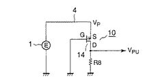 - 前記リセット信号出力回路の前記リセット信号の出力端子(5)と前記電源(1)からの電源ライン(4)との間に、前記電源電圧(Vp)が前記下限値より小さい所定電圧以下で遮断し当該所定電圧を超えると導通するエンハンスメント型の第2のスイッチング回路(10)を介挿したことを特徴とする請求項1乃至3のいずれか1項記載のリセット信号発生回路。