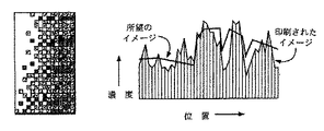 図1は従来の技術で経験された問題を示す。大抵の市販の印刷装置は、限られた範囲で画素の明暗度を変更できる。誤差拡散は、モネの画法のように、濃い画素の比率を変えることにより、完全なグレースケールの出現を可能にする。用紙上の当該特定の位置の上をその印刷装置のヘッドが移動するとき、所望のイメージに基づいて、インクジェット印刷装置のヘッドからの特定のインクジェット又はインパクト印刷装置からのワイヤが射出されるべきかどうかを決定する計算が行われる。実際のイメージの所望の濃度が、当該位置にインクが射出された場合の用紙上のインクの推定濃度と比較される。インクジェットノズルが射出されると、図1の縦方向の縞で示すように、実現された濃度は予め計算された濃度から幅広く変化する。実現された濃度のこの変化により、印刷されたイメージはノイズのあるイメージになる。
