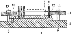 次に、第6図および第7図に示すように、背面パネル2を上方から押さえ板(平面板)11で押さえる。このとき、押さえ板11は電極ピン6に対応する位置に、背面パネル2の貫通スリット孔7と同様にスリット孔12を備えているため、このスリット孔12に電極ピン6を貫通させる。次に、ベースプレート8のねじ孔9にねじ13を螺合させ、締めることによりベースプレート8を押さえ板11で仮固定する。このとき、前面パネル1と背面パネル2はその全面にわたって押圧されることから、両パネル1,2は均一に密着する。このねじ13による固定は少なくともベースプレート8の四隅に形成されたねじ孔9に対して行われるものであるが、必要に応じて第6図に示すように押さえ板11の周囲に例えば8箇所に対して行われてもよい。