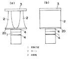ホーン2としては、その基端から先端にかけて湾曲した側面を備えたもの、特に図6(a)に示すように指数または指数状に形成されたものや、懸垂面を備えたものを好適に用いることができるが、図6(b)に示すように、両側面が傾斜した平面となっているもの、図6(c)に示すように、一様断面を持つものであってもよく、さらにはその振動子部側と出力側とを結ぶ方向と直交する断面が図示例のような角型断面ではなく、円断面を持つものであってもよい。さらにホーン2はアルミニウムまたはアルミニウム合金のような軽金属または軽合金で形成するが、チタンなどの金属で形成してもよい。