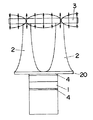 以下本発明を実施の形態の一例に基づいて詳述すると、図1において、振動子部1は伝導性金属シート4(ニッケルまたはベリリウム銅からなるものが好ましい)を間に挟み込んだ圧電素子または磁歪素子を駆動源として電気振動を機械振動に変換するもので、円柱状に形成されている振動子部1の一端側にはベース20を介して2本のホーン2,2が取り付けられている。ここにおけるホーン2は、両側面が湾曲面となっている板状のもので、太くなっている基端側がベース20に接続されて、細くなっている先端側が出力側となっており、2本のホーン2,2は平行に並んでいる。そしてホーン2の出力側である先端側には平板状の共振板3が取り付けられて、2本のホーン2,2の出力側は共振板3を介して連結されたものとなっている。なお、図示例では一枚の共振板3を2つのホーン2,2に跨らせて取り付けているが、複数枚の共振板3を夫々2つのホーン2,2に跨らせて取り付けてもよい。