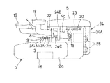 前記電磁式ピックアップ装置11は、前記胴本体2の上面で天板5の下駒6側端部付近に前記弦3の下方に位置するように配設されている。このピックアップ装置11は、一方の磁極(例えばN極)が弦3と対向するように配設されたマグネット26と、このマグネット26を収納する絶縁材からなるケース27と、マグネット26の周囲に巻回された図示しないピックアップコイル等を備え、弦3の振動を電気信号に変換する。すなわち、演奏時に弦3を弾いて振動させると、当該弦3とマグネット26との距離が変化するためマグネット26の磁界が変化し、電磁誘導作用によってピックアップコイルに弦振動に応じた起電力が発生する。そして、この起電力は、増幅器によって増幅され、スピーカから演奏音として発音される。なお、このような電磁式ピックアップ装置11は、従来周知である(例えば、実開平5−30896号公報、特開平1−211797号公報等)。