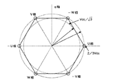 そこで、第1の従来技術として電圧指令の制限値を六角形辺上とする例がある。この場合、最大に出力できる電圧振幅指令は0〜60゜区間において電圧位相指令とともに変化し図9の様になる。1相分の電圧指令変化としては0〜360゜の間では図10の様になる。この時、見かけ上出力電圧(基本電圧成分)の最大値が正弦波電圧出力方式と比較して5%程度大きくすることができる。