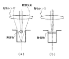 図34は、一般に知られている対物レンズの光軸と同軸な位置に照明プリズムの射出面を設けて同軸照明を実現した手術用顕微鏡の対物レンズ側から見た図である。又、図35(a),(b)は図34の側面図で、夫々90°異なった方向から見た図である。図35では血管のような微小な円筒状の障害物が、対物レンズの光軸を横切るように存在している状態を示している。ここに示された手術用顕微鏡では、図35(a),(b)に示すように、観察光束は穴の底面まで届くため、障害物があっても底面の観察はできるが、照明光束は障害物によって遮られて底面までは届かず、障害物によって影ができてしまうことになる。