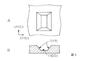 例えば、{100}面上にエッチングマスクとして長方形の穴を各辺が{110}面と平行になるように作成すると、そのマスクを用いてエッチングされた形状は、図3に示したように穴の各面が{111}面で囲まれた形状になる。これは{111}面のエッチングレートが他の結晶面のエッチングレートに比較して遅いことによる。この時、マスクの穴の幅(エッチングされた穴の幅)をxとすると、エッチング深さ(穴の深さ)tが下式で示す値になった時、エッチングは自動的に停止する。