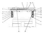 4は軟磁性材料からなるステータであり、外筒及び内筒とそれらを結ぶ連結部4cとで構成される。ステータ4の外筒はその先端部が軸方向に延出する複数の歯、すなわち櫛歯形状によって構成される。この軸方向に延出する歯の数はマグネット1の着磁分割数nの1/2にて形成され(本実施例では8つ)、これらが外側磁極4aを形成している。外側磁極4aは円周方向に720/n度(本実施例では45度)ずつ等分配置されて形成される。また、ステータ4の内筒は中空柱形状により構成され、内側磁極4bを形成している。この構成により駆動装置の直径を最小限にしつつ磁極の形成が可能となる。すなわち外側磁極を半径方向に延びる凹凸で形成すると、その分駆動装置の直径は大きくなってしまうが、本実施例では軸方向に延出する櫛歯形状により外側磁極を形成しているので、駆動装置の直径を最小限に抑えることができる。