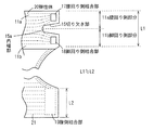 そして、おむつ体1の背側腰回り部11は、展開状態におけるおむつ体1の長手方向の一端側に形成され、この展開状態からおむつ体1が適宜に折り曲げられて、被装着者の腰回りの背部側に位置する部分となっている。そして、この背側腰回り部11は、おむつ体1の幅方向が長い略矩形形状に形成され、背側腰回り部11のおむつ体1の長手方向における両側部に形成された背側結合部16は、おむつ体1の長手方向に切り欠き部15によって、おむつ体1の長手方向外側に位置する腰回り側結合部17と、おむつ体1の長手方向内側に位置する脚回り側結合部18とに分割形成されている。