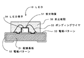 54は、上面電極52aに一方の電極を銀ペーストによりダイボンディングしたGaN系の青色LED素子である。55はAu線等より成るワイヤであり、ワイヤ55によりLED素子54の他方の電極と上面電極53aとがワイヤボンディングにより接続されている。56は、LED素子54、LED素子54の接続部及びワイヤ55等の保護と、LED素子54の発光を効果的にすることのために封止している、透光性のエポキシ樹脂等から成る封止樹脂である。封止樹脂56には予め57の蛍光物質(YAG蛍光体)を含有させてある。