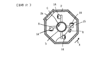 同図において、1は軸受用のブラケットで、図示しないベース上に所定の間隔で配置されている。2は軸直角断面が8角形に形成された箱体で、その一面に着脱可能な蓋2aが設けられ、両端には中空の軸2bが形成され、軸受3を介してブラケット1に回転可能に支持されている。4は伝動部材で、前記軸2bに固定され、図示しない電動機からの動力を箱体2に伝える。