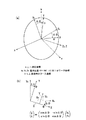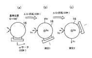 次に、図4を用いて、本実施の形態の作用を説明する。まず、φ回転を90゜に設定し、手動でワーク1をω回転させて検出器出力が概略ピークとなる位置に設定する。この姿勢でワーク座標XYZが図3のように設定される。ここで第1の実施の形態と同様にφ回転0゜及び90゜でそれぞれx軸方向、y軸方向へのh1 の傾斜角δ0 (1) ,δ90 (1) を求める。次にワーク1を約90゜CW方向へω回転させ、この位置で同様にφ回転0゜でx軸方向へのh2 の傾斜角δ0 (2) を求める。図4の作図から分るように、δ0 (1) ,δ90 (1) ,δ0 (2) よりh0 の傾斜角、δ0 (0) ,δ90 (0) が求められる。