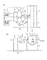 図5乃至図10には、本発明の第3の実施の形態を示す。まず、図5を用いて機構部の構成を説明する。同図(a)は同図(b)のA−A線断面図、同図(b)は同図(a)の右側面図である。プレート17が接着された円筒形の結晶インゴットであるワーク16が被検体である。ワーク16は保持手段としての載置台18にプレート17を係合させて取付けられる。載置台18はZフレーム23で支持され、略ワーク16の軸であるω軸に対しω駆動部19によりω回転される。Zフレーム23はZ駆動部24によりZ(ω軸)方向に駆動され測定点Cの位置が変更できる。測定部15は、X線管25によりワーク16側面のC点にX線ビーム26aを照射し、その回折されたX線ビーム26bをX線検出器27で測定する。X線管25とX線検出器27はδフレーム36上でC点を中心に角度2αをもって配置されている。δフレーム36はC点を中心にδ駆動部30によりδ回転される。φ駆動部31はδフレーム36とδ駆動部30をC点を原点とするz軸(=φ軸)の周りに回転させる。φ回転位置0゜でδ回転面が水平、90゜で垂直になる。φ駆動部31はz駆動部32によりz方向に駆動されC点をワーク16の側面に合わせる。測定部15は、測定座標xyzを基準に動き、この座標xyzで結晶面法線を求める。ワーク16に固定されたワーク座標XYZはプレート17を基準に設定され、図示されているω回転基準位置(Ω=180゜)のとき測定座標と方向が一致するように設定されている。ワーク16のω回転角は後述する極座標ωと区別するため大文字Ωで表し、X軸がz軸方向を向いたときΩ=0゜としCW方向を+にとる。X線管25は管電圧40kVの銅をターゲットとするもので、約8keVの銅の特性X線Kαを使用する。X線検出器27はガスを用いた比例計数管であり、X線のフォトンカウントを行うものである。