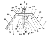 そして、この垂直板50の両端側には、円弧状体51方向に屈曲させて、この円弧状体51と一体構成の強度を図る縁折り54,54が形成されている。しかし、この縁取り54は両端側に必ずも必要なものではなく、一方側のみに縁取り54を形成してもよいし、縁取り54を全く形成しなくてもよいが、強度性を考慮すると少なくとも一方の縁取り54は必要である。図中、58は、垂直板50に穿ったボルト穴である。