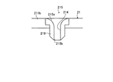 図8に示す一体構造の場合には、例えば、ピストン21の頂面部211bに相当する部分をプレスで打ち抜き、塑性変形させることにより形成することができる。別体として構成する場合には、図6に示すように、順流側入口部215aはピストン21と一体的に形成し、突起部(逆流側入口部215b)をピストン21とは別体のチューブ218により構成することができる。また、図7に示すように、流体素子215に対応する部分の全体を、チップ219により構成することができる。