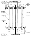 また、図2は、アンテナ電極型のCat−PECVD法を実現する装置の一例を示す全体図であり、平板状の基体の製膜面が紙面に垂直方向に向いている場合に熱触媒体が内蔵されたアンテナ電極位置における断面図である。図3は、アレイ状アンテナ電極をその中心軸方向から見た断面図である。