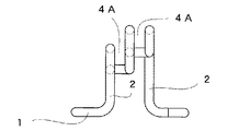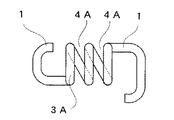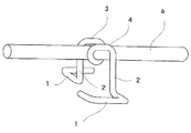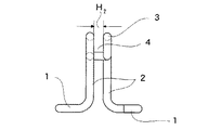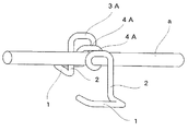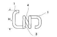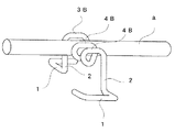 螺旋巻回部3には、図3,5に示すように、螺旋巻回に基づき一つの正面U溝状の鉄筋受架部4が形成され、該受架部4の溝幅H2は鉄筋aの直径と略々等しいか或いはこれより若干小さく、鉄筋aを摩擦嵌合状態に嵌め込むことができる構成になっている。鉄筋受架部4はこれを構成している金属線材の保有弾性に抗し多少は押し開くことができ、少し太めの鉄筋であっても保有弾性を利用して無理に押し入れ嵌め込むことができる。