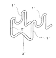 該螺旋巻回部は、平行に並ぶ異なる仮想平面に沿って前記金属線材が巻回することで形成される少なくとも3つの平面状部を備え、隣り合う2つの該平面状部と、該隣り合う2つの平面状部に連続する金属線材とによって、前記仮想平面に平行な方向から見て複数個且つ高さを異にする正面U溝状の鉄筋受架部を構成し、選択された1つの上記受架部内の前記隣り合う2つの平面状部の間に鉄筋を摩擦嵌合状態に嵌め込むことができる構成になっていることを特徴とする鉄筋受け。 - 一本の金属線材を屈曲加工して構成した鉄筋受けであって、