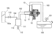 本発明の一実施例による電磁弁を用いたORVRシステムを図2に示す。燃料タンク100とキャニスタ110とを一系統の配管102と配管103とが接続している。電磁弁10のハウジング11に第1接続管12および第2接続管13が形成されている。第1接続管12はキャニスタ110側の配管102と接続しており、第2接続管13は燃料タンク100側の配管103と接続している。圧力センサ101は燃料タンク100内の圧力をチェックし、蒸発燃料の漏れをチェックする。