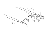 また本体2の底板24の下面側にも帯状の弾性材Cが全長にわたって貼着されており、この弾性材Cは屋根面から強風と共に吹き上がって来る雨水が隙間に侵入するのを防ぐものである。
