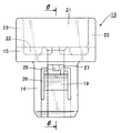 脚部14の側面には、半径方向外方に弾性的に突出してエアバッグ取付部及びボデーパネルの両取付穴の縁部に仮止めできる弾性係止片19が、一対設けられている。弾性係止片19は、ピン11が軸穴18に挿入されると半径方向内方への撓みが阻止されて本止め状態にされ、ピン1が軸穴18にない場合には軸穴内方へ撓むのを許す仮止め状態にされる構成である。弾性係止片19の各々は、脚部14の先端(図3、4、6の下端)側を根元としフランジ15の側を自由端とする弾性片として形成されている。そのため、図3に図示のように、弾性係止片19の周囲には、U字を逆さにした形状のスリット26が形成されて脚部14の本体から分離して、弾性係止片19(特に自由端側)に弾性を与えている。弾性係止片19の外面には、エアバッグ取付部及びボデーパネルの両取付穴の縁部に係止する係止肩27が形成されている。弾性係止片19は、係止肩27から脚部先端に向けてなだらかに傾斜して形成され、脚部14をエアバッグ取付部及びボデーパネルの両取付穴に挿入するとき弾性係止片19が障害にならないようにしてある。係止肩27の位置は、エアバッグ取付部及びボデーパネルの厚さに合わせて適当に定められる。なお、弾性係止片19の先端(図5の上端)は、後述の支持プレートに係合できるように脚部14の外面よりやや外側に突出しているのが好ましい。