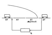 まず、車上装置の位置認識の方法について説明する。トランスポンダ地上子7は,図3に示すように、レールに沿って所々に設置され、そのトランスポンダ地上子が設置されたブロック番号(図3では4T)と、当該ブロックの終端からトランスポンダ地上子7までの距離Lが、トランスポンダ車上子8による読み出しが可能なデータとして地上子内に記憶されている。トランスポンダ車上子8がトランスポンダ地上子7の直上を通過すると、それらの情報がトランスポンダ車上子8に読み込まれる。車上のATC制御部4内には、自列車の位置の記憶、更新のため位置レジスタ41が設けられており、この位置レジスタ41は、ブロック番号と、ブロック内残距離とを格納するようになっている。トランスポンダ車上子8がトランスポンダ地上子7の直上を通過するとき、トランスポンダ車上子8は、トランスポンダ地上子7のデータ(前記ブロック番号4Tと距離L)を読み込む。トランスポンダ車上子8は、読み込んだデータをATC制御部4に送り、ATC制御部4は、ブロック番号と前記距離Lの情報をトランスポンダ車上子8から受けると、図4に示すように、位置レジスタ41内のブロック番号とブロック内残距離を、トランスポンダ車上子8からの情報でセットする。