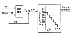 得られた許容速度V1は比較処理部4Cに送られ、速度発電機10から出力された速度パルスに基づいて自列車速度算出部4Bで算出された自列車速度Vtが、許容速度V1から減算される。比較処理部4Cは、自列車速度Vtと許容速度V1の偏差ΔV(=許容速度V1−自列車速度Vt)の値に応じて、図15に示すように、段階的なブレーキ力のブレーキ指令を、ブレーキ装置5に出力する。すなわち、図10に示すように、速度パターンを基準にブレーキの強弱が調整されながら、この速度パターンに沿って減速され、ブロック3Tの終端までに停止するような制御が行われる。