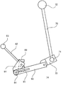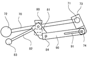 そして、開閉プレート81及び接続プレート73の間には、操作リンクプレート90が設けられている。この操作リンクプレート90は、その一端が開閉プレート81に軸部84を中心に回動可能に連結されている。操作リンクプレート90の他端は、接続プレート73の端部に回動可能に且つスライド移動可能に連結されている。つまり、操作リンクプレート90の他端には、長手方向の長穴91が形成されており、これに接続プレート73の端部に固定された軸部74がスライド移動可能に挿入されている。軸部74は、図5に示すように、ワッシャ74a及びバネ75に挿入されており、このバネ75によって、操作リンクプレート90が接続プレート73に対してワッシャ74aを介して所定の圧力で付勢されている。
