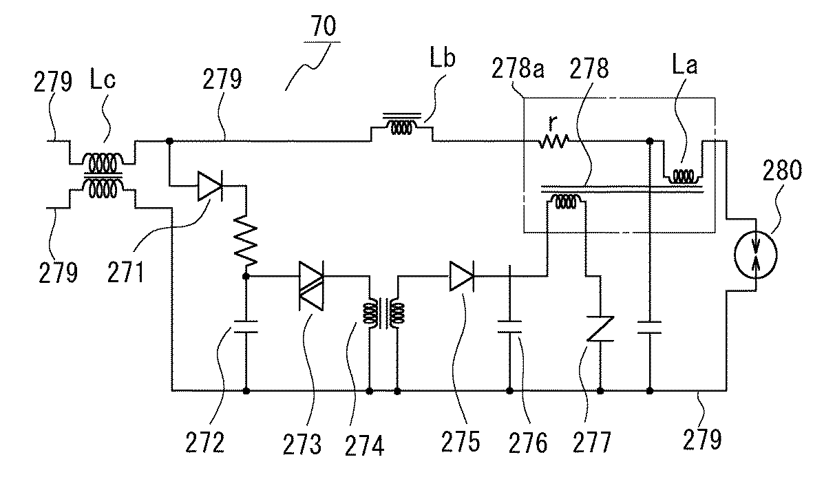 前記トランスおよび前記少なくとも1つの抵抗は、前記インダクターの巻線抵抗値を選択することにより得るようにしてもよい。巻線抵抗値は、おおよそ1オーム以下に選定されることが望ましい。これは、発熱及び高圧印加時において抵抗による電力の損失を防ぐためである。