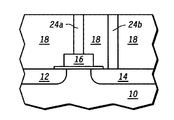 図2に移り、通常タングステン(W),チタン(Ti),および恐らくは銅(Cu)で形成する導電層22を堆積する。図3において、化学機械式研摩(CMP)によって導電層22を研磨してこの層を平面化し、開口20内にコンタクト24a,24bを規定する。コンタクト24は、第1層間誘電体18の上面と同一面となる。コンタクト24a,24bは、層間誘電体を貫通する導電性部分を形成する。