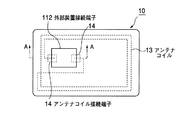 図1の平面図では接触型非接触型共用ICカードであるため外部装置接続端子112をカード表面に有するが、端子パターン形状等は省略されている。また、カード周囲に鎖線で表示するのはカード内部にアンテナコイル13が存在することを示している。アンテナコイル接続端子14はアンテナコイルの両端とICモジュール基板の接続端子114を接続するためICモジュール装着部用凹部18に臨むように形成されている。