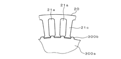 図9は、ギア形状を有するローラ300aと積層体20との係合状態を示す図である。図9に示すように、ティース部21cの先端部間、すなわちスロット21aの内径側開口部にローラ300a表面に形成されたくさび300bを挿入しながらこのローラ300aを回転させることにより、積層体20が曲げられる。このとき、隣接するティース部21cの先端部の間にはローラ300aのくさび300bが挿入されるため、先端部間の周方向幅がくさび300bの周方向幅よりも小さくなることはなく、ティース部21cの周方向位置を拘束することができる。なお、ローラ300aの表面に形成されたくさび300bは、スロット21aの内部まで進入しない程度の高さに設定されている。また、くさび300bの周方向幅は、最終形状としての固定子鉄心21のスロット21aの先端部間の周方向幅にほぼ一致するように設定されている。