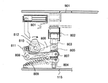 アーム806はベース板115をコ字状に折り曲げた側板840上に設けた固定軸808に回動自在に支持されていると共に付勢バネ809によって下方に付勢されている。アーム806の上方には、ベース板115の側板を貫通して回転自在に支持されているカム軸810が設けられている。アーム806のもう一方の端にはコロ811が設けられており、コロ811はカム軸810上に配設されたカム812に当接するように設けられている。