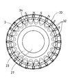 図10〜12は半導体産業におけるスパッタ応用のために用いられる従来のマグネトロン型のプラズマ源を簡素化した図を示している。反応容器50は、基本的に、非磁性金属で作られた上部電極51と、円筒形の側壁52と、底部プレート53と、下部電極59とによって構成されている。上部電極51と下部電極59は反応容器50の少なくとも主要部分(内部空間)を介して互いに平行である。側壁52と底部プレート53は例えばステンレス鋼のような金属で作られている。側壁52の上側部分は絶縁物54で作られており、その絶縁物54の上に上部電極51が配置されている。スパッタされることを必要とされる物質で作られたターゲットプレート55は上部電極51の下側表面に固定されている。ターゲットプレート55は上部電極51よりも少し小さい寸法を有している。上部電極51の上側表面の上に中心磁石56aと外側磁石56bが同心円的に配置されている。中心磁石56aは円形の形状をしたブロックである。外側磁石56bはリング形状をしている。磁石56a,56bの高さと幅は重要な事項ではなく、反応容器の寸法に従って選択され得る。磁石56a,56bは、上部電極51の上に、反応容器50の内部に向かう反対の磁極を有するように配置されている。これらの磁石のかかる配置は、図11に示されるように、中心から周辺に向かうあるいはその逆に向かう磁界57を生成する。