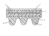図1は、Vリブドベルトの一例の横断面図を示し、ベルト表面層は、単層又は複数層のゴムコート帆布1にて形成されており、これに隣接して、例えば、低伸度の心線2が埋設された接着ゴム層3が積層され、更に、これに隣接して、リブ4を備えた圧縮ゴム層5が積層されている。多くの場合、圧縮ゴム層5には、その耐側圧性を高めるために、ベルトの幅方向に短繊維6が配向して分散されている。