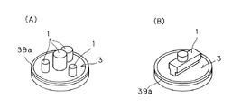 カートリッジ交換装置8,9は、カートリッジ保持手段6,7に対してカートリッジ1,2を交換する装置であり、複数のカートリッジ3,4を着脱自在に保持する機能を備える。カートリッジ交換装置8,9は、旋回輪状の交換カートリッジ保持部材41,42が支持台53,54を介して水平旋回自在に支持された旋回式のものとされ、割出機構20により任意のカートリッジ3,4がプレス位置Pに来るように旋回させられる。割出機構20は、上下のカートリッジ交換装置8,9を、それぞれサーボモータ等の駆動源20a,20aにより伝達機構20b,20bを介して旋回駆動させるものであり、上下のカートリッジ交換装置8,9は例えば同期して駆動される。上下のカートリッジ交換装置8,9は、必ずしも同期させる必要はない。例えば下方のカートリッジ交換装置9のみを旋回させてもよい。また、上記のカートリッジ交換装置8,9を共に旋回駆動する場合においても、完全に同期させる必要はなく、多少の動作タイミングのずれや動作速度の違いがあっても良い。なお、割出機構20は、例えば図12のように、上下のカートリッジ交換装置8,9を共通の駆動源20a′により伝達機構20b′を介して同期して旋回駆動可能としたものであっても良い。