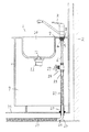 本発明は図1に示すように、洗面台,流し台,浴室,トイレ等のうち洗面台1は背面を壁2に沿って設置し、湯水混合水栓よりなる水栓3と、この水栓3が取り付けられる天板7と、この天板7を上載するキャビネット9と、天板7の前面に固定した洗面ボウル10とを設け、この洗面ボウル10の底部には排水口11を設けて、キャビネット9の内部に配置されている配水管12により洗面ボウル10に溜まる湯水は外部へ排出される。