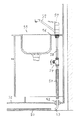 湯及び水用の通水管13は容易に屈曲できる合成樹脂製のポリブデンやポリエチレン管等で形成し、外周面に被覆材14を覆って装着することで外部と接触して傷付くことがないように保護し、床板15の下では建物の躯体工事の際に予め配設された蛇腹状の鞘管17内に押し込むことで鞘管17により覆われて外部から保護されており、上流側を湯及び水の各ヘッダ(何れも図示省略)に接続し、下流側はキャビネット9内に向けて垂直方向に折り曲げ、床板15に穿設した取付孔16に固定した後述する貫通金具20に挿通し、先端にはハンドル19を回転操作することで水栓3への湯,水の止水,通水を可能にする止水栓18が装着され、この止水栓18の上部を前記連結管6と接続している。