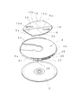 そして、インナーロータ4は円形の皿形に成形されていて、底部4bの外周に円形で垂直状の外周壁4cが一体成形され、その底部4bの中央部から外周にかけて、下シェル3の開口部5と相似形状の開口4dが形成されている。そして、このインナーロータ4が上下シェル2、3間に形成された円形のインナーロータ収容部8内に水平状に組み込まれて、回転自在に取り付けられていて、そのインナーロータ4の底部4b上で、外周壁4cの内部に形成された記録媒体収納部であるディスク収納部6内にディスク状記録媒体であるDVD等のディスクDが水平状で、回転自在及び一定量の上下動が可能な状態に収納されている。