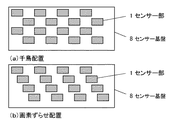 図5は千鳥の2列の素子列を向かい合わせて配置し4分の1ピッチずらせて配置している例である。互いの2列の千鳥の素子を合わせると4素子で空間的に1ピッチを構成する。このように構成すると信号読み出しにおいて、向かい合わせの基盤に対し交互に読み出しを行うので、隣接する素子からの漏洩信号が減衰してから隣接素子の読み出しを行えるので、互いに隣接する素子の信号の影響を避けることが出来る。