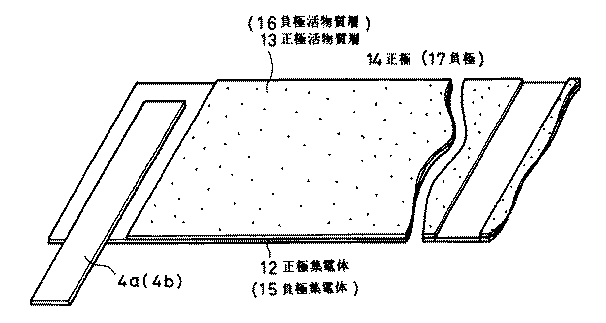 これら正極および負極を構成する原反は、それぞれ裁断されて、正極14および負極17が構成され、これらが、両活物質層13および16間に両活物質層13および16の物理的接触を避けるために図4に示すように、セパレータ19を介して重ね合わされ、両端子リード4a、および4bを平行に配置させる状態で扁平状に巻回して、図6に示すように、中心部から両端子リード4aおよび4bが、平行に導出された素電池1を構成する。