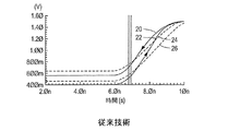 図2は、図1内におけるようなバッファ回路の出力を示す。1ナノ秒か又はそれを超える処理電圧及び温度の伝搬遅延内における差は、そのような設計において共通である。図2は、低及び高VCC並びに極端の温度の(同時に存在する両極端のいくつかのパラメータの)コーナーのプロセス状態を含む4つの極端なPVT状態についての出力波形を示す。グラフ22と比較されたグラフ20は、+110℃から−40℃までの温度変化による変動を示す。グラフ24と比較されたグラフ20は、+3.45Vから+3.15VまでのVccの変化と同時に、「高速」から「低速」までのプロセスの変動を示す。グラフ26は、+3.15V、−40℃、及び低速プロセス状態におけるグラフである。本発明の回路構成による同様のパラメータ変動が、図4内に示されており、そこでは、図2内での1ナノ秒の遅延が、0.1ナノ秒未満(40)に低減されている。