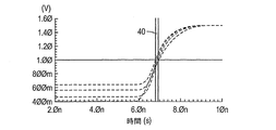 図4は、図2のグラフとの比較を示し、低速な出力エッジが維持されるが、温度、供給電圧、及びチップ製造プロセスにおける変動にわたる、約0.1ナノ秒未満の遅延40が存在する。工業上の温度範囲の−40度Cから+85度Cまでが、温度変動を判断するための基準として使用され、電力供給変動においては、3.3Vからの+/−5%が、判断するための基準として使用される。プロセス変動は、容易には標準化されないか又は定量化されないが、典型的には、「低速」プロセスが、エミュレートされる。該「低速」プロセスにおいて、閾値電圧はより高く、電流駆動はより低く、及び抵抗は増加する。