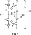 依然として図3を参照すると、ワンショットパルスは、代替として、トランジスタ20と22とをターンオンさせる。ダイオード30と32とが、トランジスタ20と22とがオンの時には、出力トランジスタ38のゲート34における電圧スイングを制限する。ダイオード間の電圧降下を、ワンショット駆動が出力トランジスタ38の閾値に実質的に打ち勝つことになるように出力トランジスタ38の閾値に一致させるために、サイズ調整することができる。更に、ワンショットパルス幅の設計は、温度補償を組み入れることができる。該温度補償において、温度が上昇して出力トランジスタの駆動が弱まった時には、パルスが延長されることになり、弱まっているトランジスタを打ち消すより強力なイニシャルパルスが提供される。温度によって延長されたパルス幅を提供するワンショットの設計は、当該技術分野において周知である。そのような設計は、タイミングコンデンサを組み入れることができる。該タイミングコンデンサは、温度によって値が増加するか、又は該コンデンサを駆動する電流源が温度によって減少させられることができる。いずれかの場合か、又はその組み合わせにおいて、温度上昇によって、パルス幅がより長くなることになる。