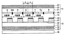 また、各RGBフィルタのサイズおよび膜厚は、反射領域aおよび透過領域bの双方において、ほぼ等しくなっている。また、Yフィルタのサイズおよび膜厚は、RGBフィルタのサイズおよび膜厚とほぼ等しくなっている。尚、必ずしもサイズおよび膜厚を等しくする必要はない。尚、フィルタのサイズまたは膜厚を変更すると各色の明るさが変化するので、ホワイトバランスが崩れないように各色のフィルタを設計することが好ましい。